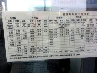 안양 시외버스터미널 버스시간표를 손 쉽게 확인하세요. 이 페이지에서는 최신의 안양 터미널 시외버스 시간표를 조회 할 수 있습니다. 모든 정보는 공식예매처인 버스타고의 정보를 참고 하여 매우 정확한 시간표 입니다. 아래 바로가기를 통해 이동 후 안양시외버스터미널 시간표 확인 하세요.